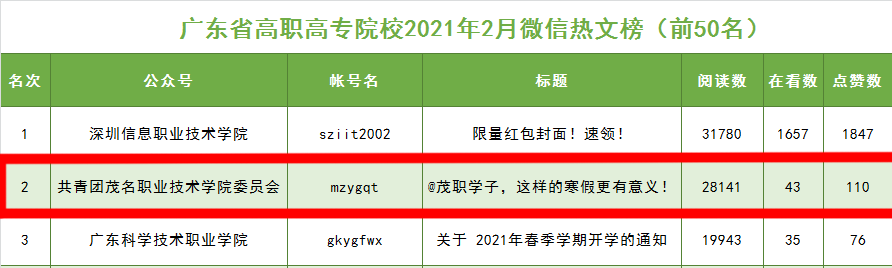 近日,广东省教育厅在“广东教育”的政务新媒体平台,发布广东高校官方微信公众号(2021年2月)排行榜。“广东高校官方微信公众号影响力排行榜”由广东省教育厅对广东151所高校以微信传播指数WCI值进行综合评分排序。“共青团茂名职业技术学院委员会”在广东高校官方微信公众号热文中(高职高专)排行榜居于第二位,并在广东高校官方微信公众号影响力排行榜(高职高专)中,排名第12名。