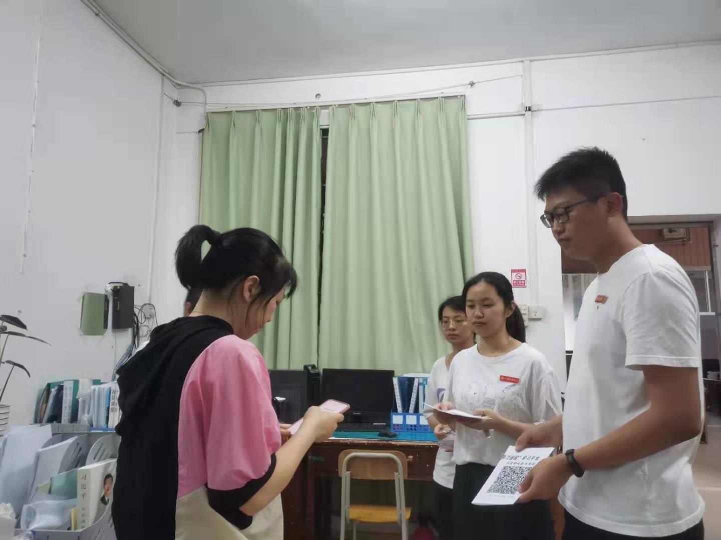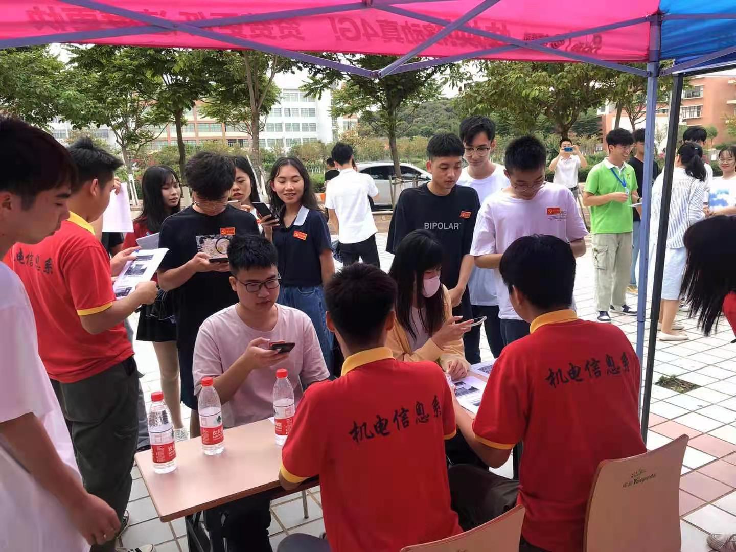 活动现场,“学习强国”宣传展架引人注目,各系部师生志愿者身穿系服格外精神,热情地向来往师生介绍推广学习强国平台,讲解“学习强国”的注册使用技巧、详细介绍各栏目的特色和主要内容以及如何通过学习平台深入进行党史学习。听了志愿者们的耐心讲解,还没下载学习强国APP的师生们纷纷掏出手机主动扫码下载注册,并加入全校学习组织,表示会经常上线学习,及时了解国家大事小事身边事。