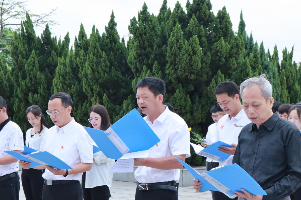 革命烈士陵园是茂名市党史学习教育基地,园内肃静,常青松高耸挺拔,烈士纪念碑巍然矗立。国旗护卫队踏着铿锵有力的正步护送花圈进场。高鹏、李锋成、贲少辉向革命烈士敬献花篮,并仔细整理花篮缎带。全体人员齐声高唱中华人民共和国国歌。全体人员面向烈士纪念碑肃立,向无数为中国人民解放事业和共和国建设事业英勇献身的烈士默哀三分钟,对长眠于此的革命先烈致以无尽哀思和深切缅怀。全体党员重温入党誓词,一句句的誓词,打开了尘封的记忆,使党员勿忘初心、牢记承诺。党团员们胸前的徽章,在阳光的照耀下,显得熠熠生辉。全体人员齐诵红色经典——李卡革命烈士遗书《天一亮,你就会看见太阳的微笑》。书中的一字一句,包含了烈士对国的义无反顾,对家的深深思念,把英雄殉国,魂佑疆土这八个字表现得淋漓尽致,敲打着每个人的心。在场人员无不为之动容。