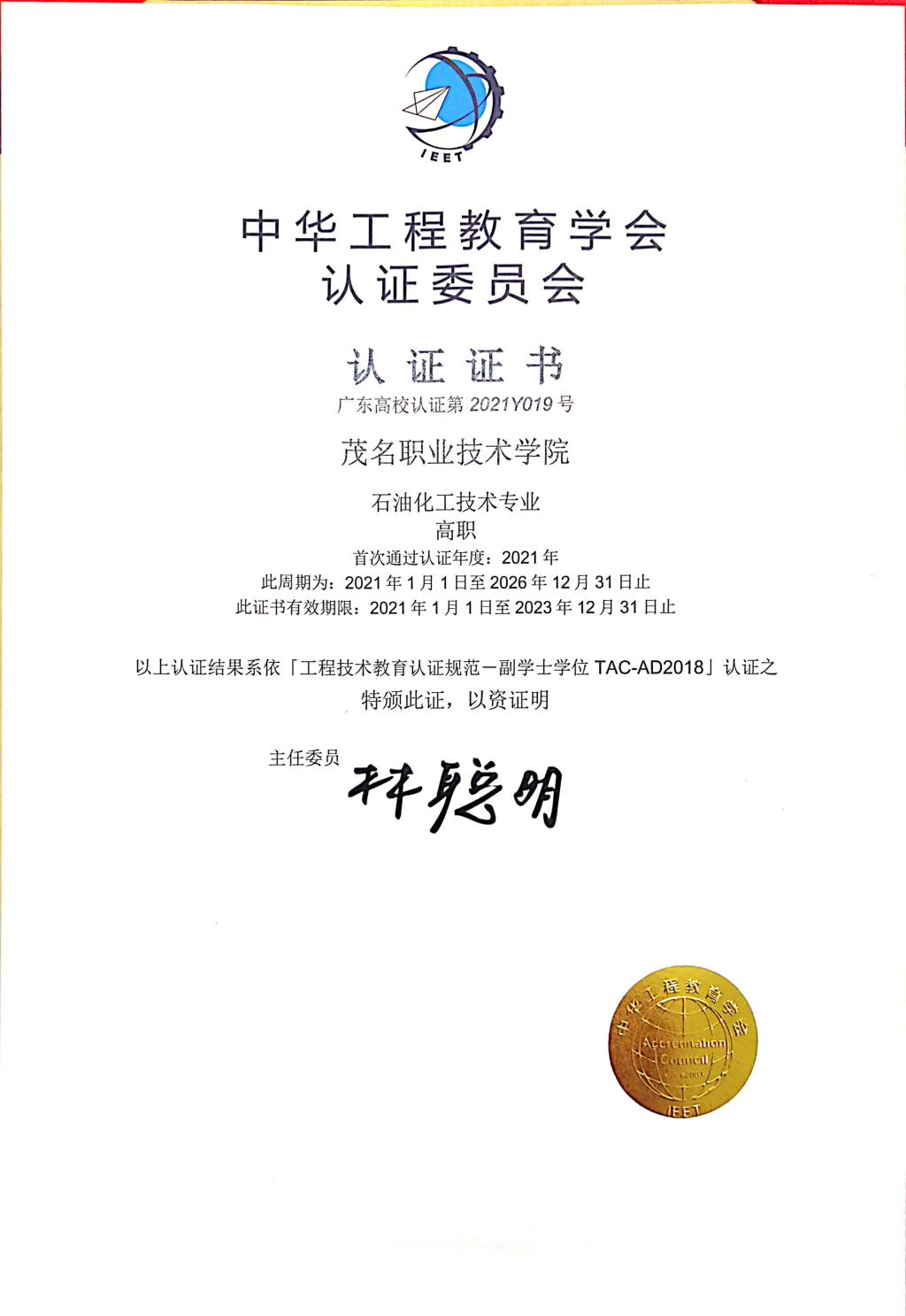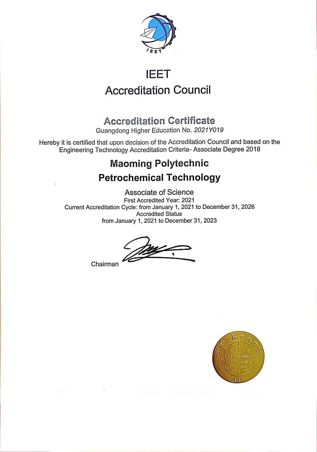 我校石油化工技术专业通过了IEET(TAC-AD)专业认证,获得中华工程教育学会认证委员会颁布的认证证书(广东高校认证第2021Y019号)。这是我校首个通过国际认证的专业,我校成为广东省粤东西北高职院校中第一个通过了IEET(TAC-AD)专业认证的学校。