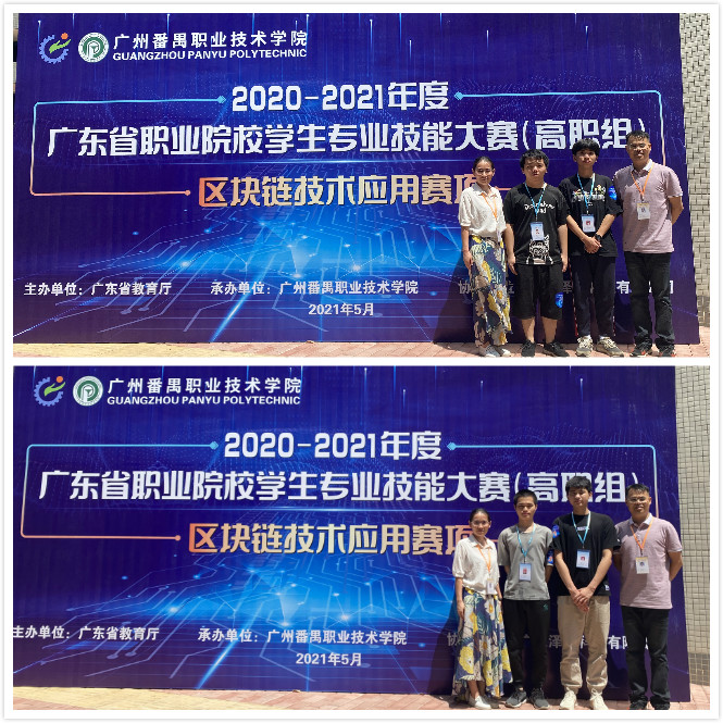 近日,由广东省教育厅主办的2020-2021年度广东省职业院校学生专业技能大赛“区块链技术应用”赛项在广州番禺职业技术学院顺利举办。我校计算机工程系派出2019级软件技术专业的张秋彬、许树彬、黄成武、简千晧四位同学组成两个代表队,在张劲勇、付玉珍、龙恒老师的悉心指导下,最终分别荣获该赛项一等奖和三等奖。