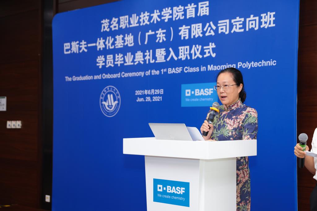 在毕业典礼上,曾萍对巴斯夫订单班的毕业学生作出寄语,希望他们能够用一生的职业生涯去践行“修德、强技、求实、创新”的茂职院精神,不断提高个人素质和能力,脚踏实地,为个人、家庭、企业和社会创造新的财富和价值。同时勉励各位毕业生在毕业后要脚踏实地、学会思考、不断学习。