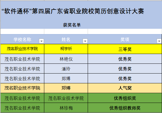 由广东省职业院校图书馆情报工作指导委员会、广东省高等学校图书情报工作指导委员会高职高专分委员会主办的“软件通杯”第四届广东省职业院校简历创意设计大赛于6月圆满结束。我校图书馆积极组织在校学生参赛,取得了喜人的成绩。人文与传媒系的柯宇祈同学荣获三等奖;林艳仪、潘玲、郑博3名同学荣获优秀作品奖;计算机工程系的郑博同学荣获最佳人气奖;学校图书馆获得优秀组织奖,林珍梅老师荣获优秀组织教师奖。