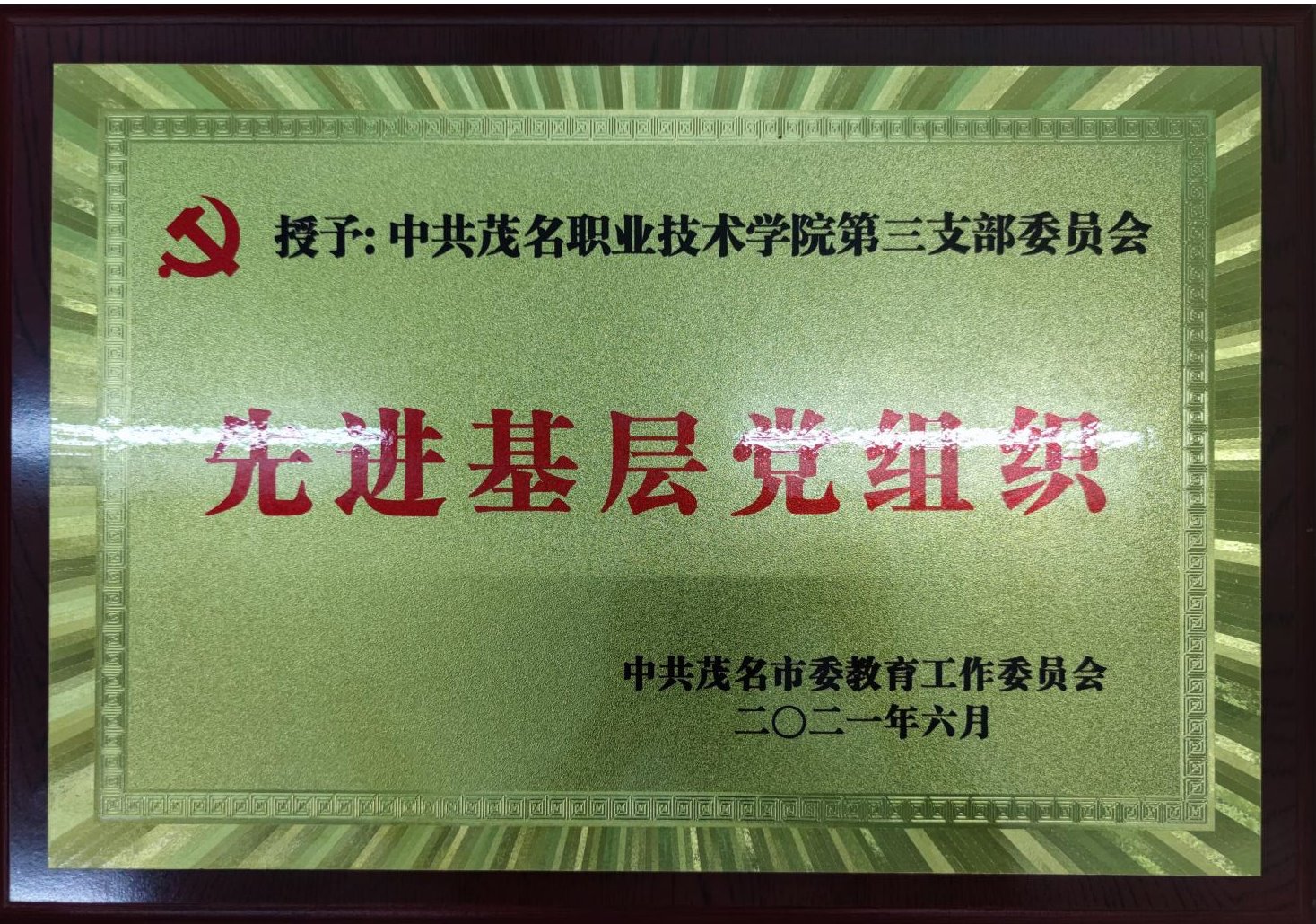 在庆祝中国共产党成立100周年之际,从中共茂名市委教育工作委员会发布了《关于公布2021年度先进基层党组织、优秀党务工作者和优秀共产党员名单的通知》(茂教工委〔2021〕56号)、学院党委发布了《关于表彰先进基层党组织、优秀党务工作者、优秀共产党员的决定》(茂职院党〔2021〕31号)的文件中获悉,中共茂名职业技术学院第三支部委员会荣获 2021年度中共茂名市委教育工作委员会“先进基层党组织”、茂名职业技术学院“先进基层党组织”。罗莎荣获中共茂名市委教育工作委员会以及学院“优秀共产党员”称号。