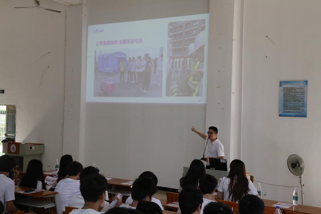 为适应智能建造体系的推进,充分发挥校企合作优势,7月9日,碧桂园集团在我校南校区进行了两场宣讲会,与土木工程系合作共育智能建筑人才。碧桂园集团高级人力资源经理李强,集团粤西区域办公室主任徐静、高级行政经理罗静怡、信息技术经理罗志尧、人力资源主管王冠文等领导走进土木工程系2019级学生中进行了面对面交流,土木工程系领导冯川萍、李振潭、教研室主任、辅导员及500多名学生参加了宣讲会。