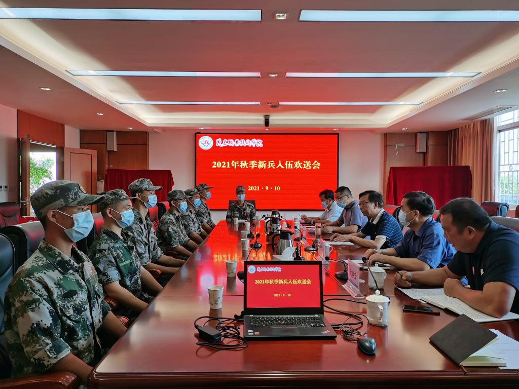 9月10日上午,我校2021年秋季新兵入伍欢送会在北校区综合楼第一会议室举行。学校党委委员、副院长谈毅,党委办、教务处负责人,学校征兵工作站全体人员出席欢送会。欢送会由总务处副处长黄焕宝主持。