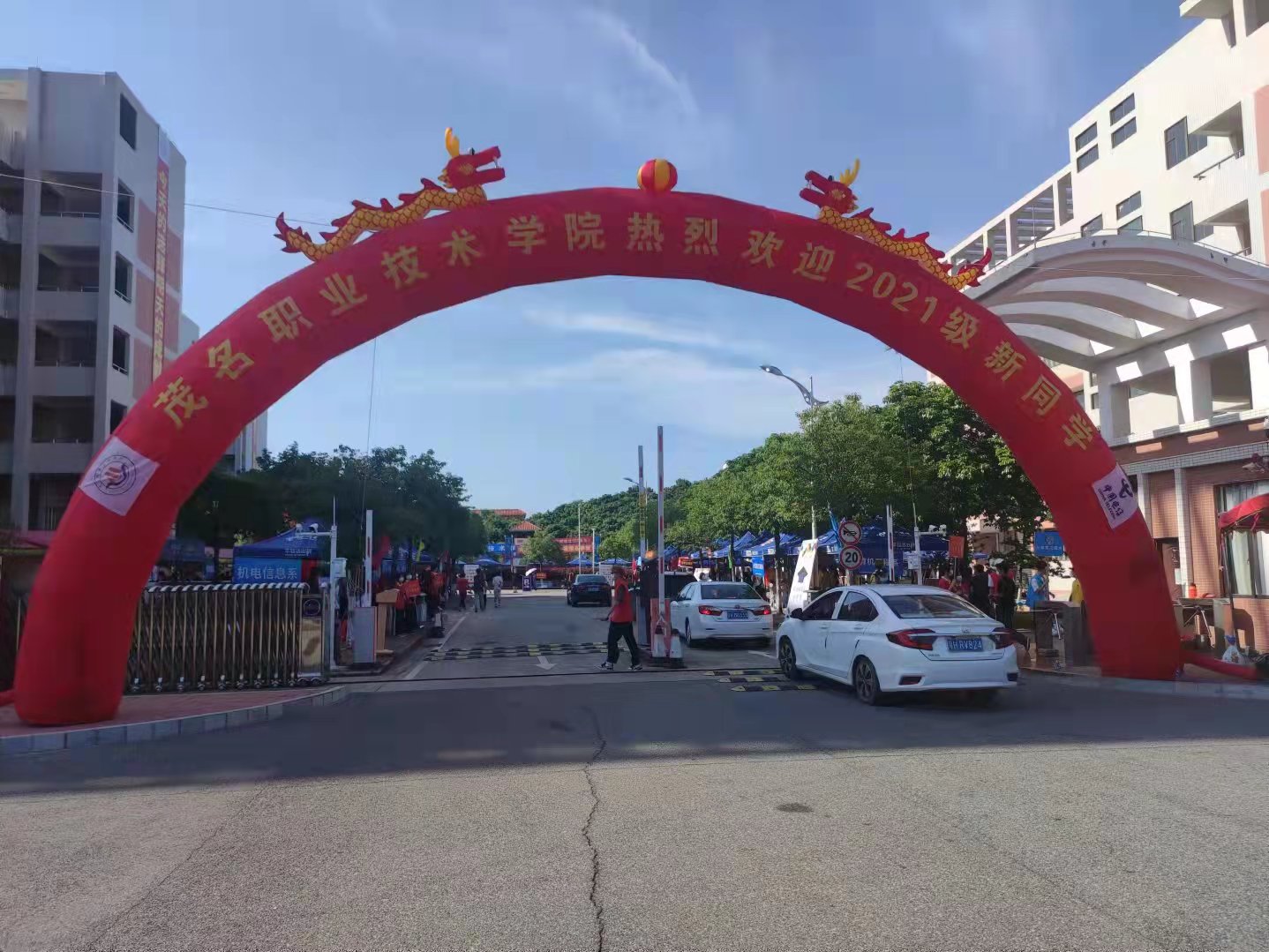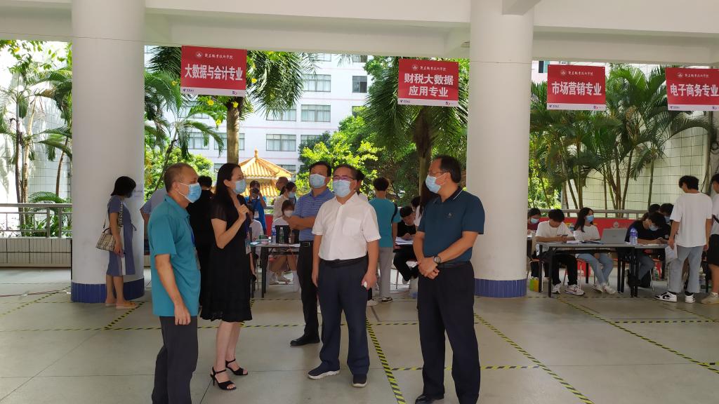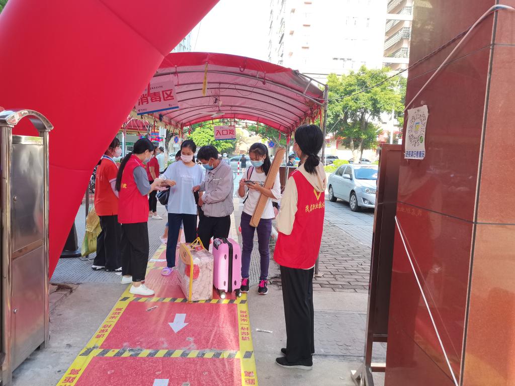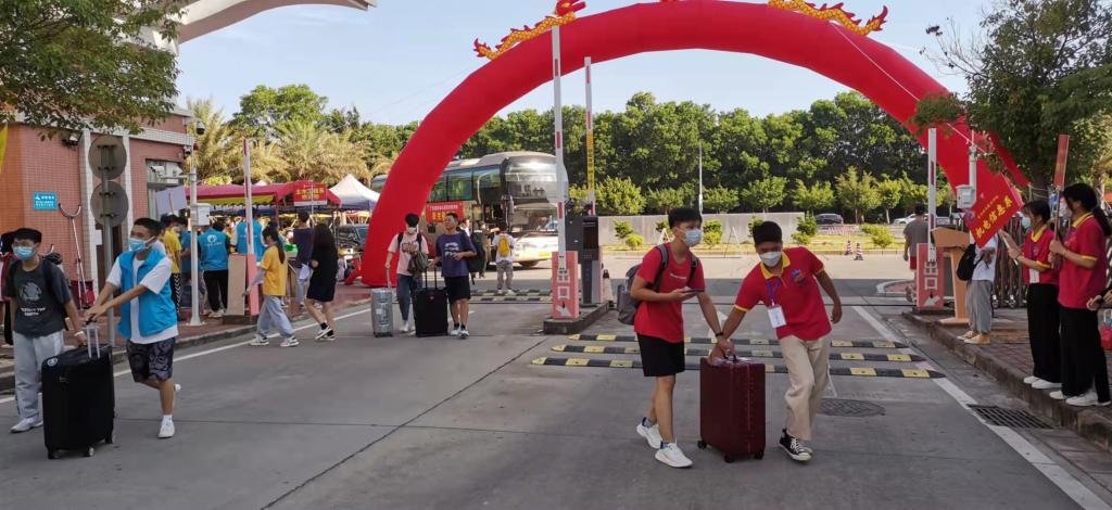 在迎新现场,保卫科工作人员、学生志愿者不畏暴晒、有条不紊疏导来往车辆,维持秩序;师生志愿者严把校门出入关口,查看粤康码、测量体温并进行行李箱消毒;学校增派医疗力量,在大门口处设立临时医学留观区。为确保新生顺利报到,在学校的统一部署下,学校团委、学生处、各系部安排1000多名师生志愿者在市内火车站、汽车站以及校内各迎新点接待。志愿者们身穿红色马甲和醒目的系服,不停地穿梭在各个迎新工作点上,热情细心地引导新生完成报到流程,帮助新生搬运行李,积极介绍校园环境和分享生活经验。相关职能部门、各系部的领导与教职工在现场维持良好的报到秩序,耐心为新生和家长答疑解惑,积极引导学生顺利入校。食堂、宿管中心精心组织,提前对食堂、学生宿舍进行全面清洁消毒,强化卫生监管,延长食堂供餐时间、丰富餐品种类。学校在校内外迎新点还设置了休息区,为新生和家长准备了矿泉水和解暑降温饮品。贴心、细致的服务得到了新生和家长一致认同和肯定。