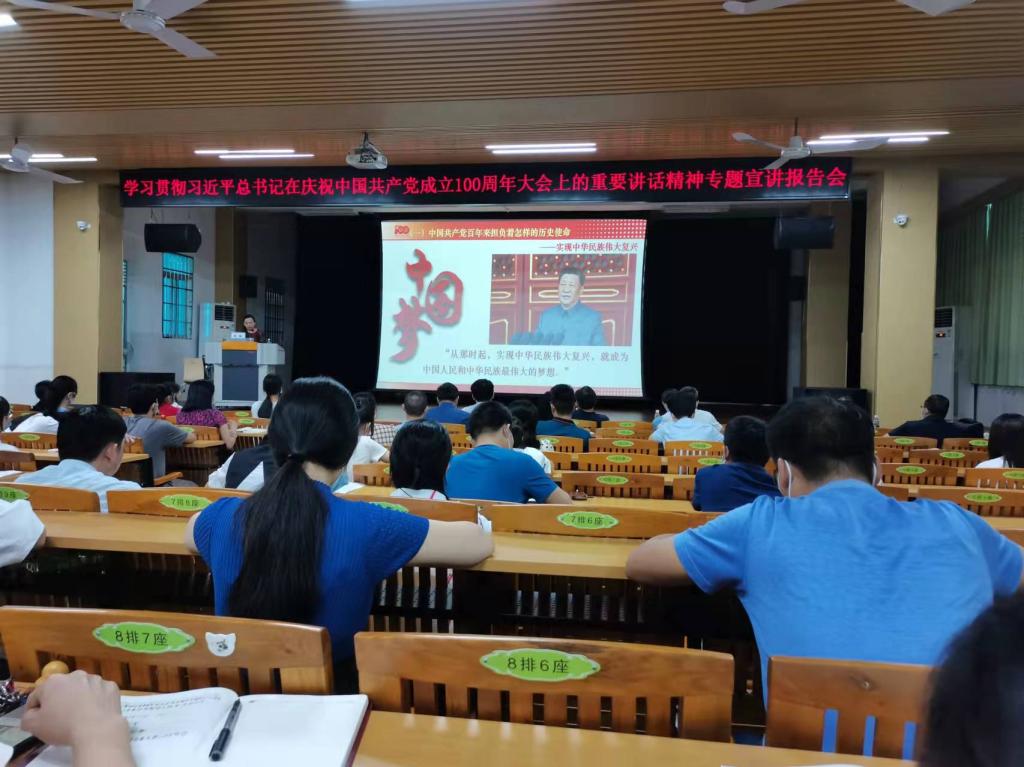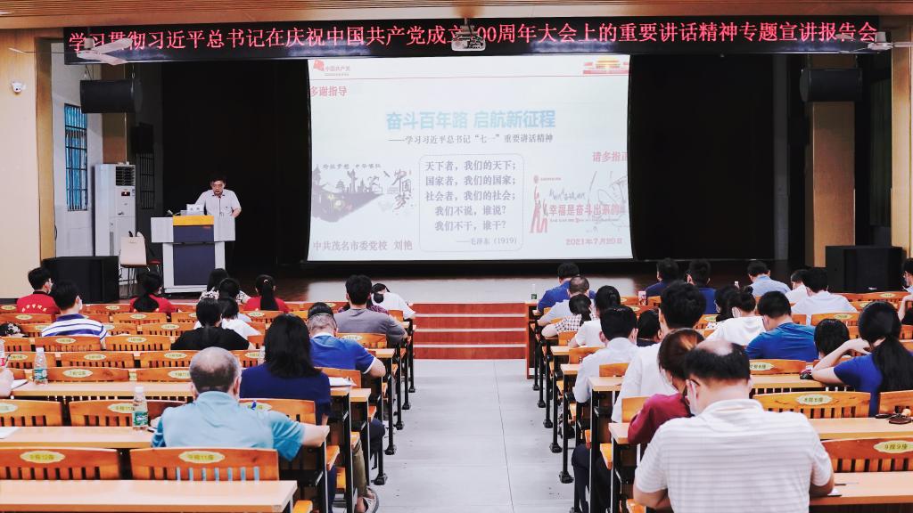 9月23日下午,学校在北校区礼堂举办学习宣传贯彻习近平总书记“七一”重要讲话精神专题宣讲报告会。中共茂名市委党史学习教育宣讲团成员、市委党校党建文史教研室主任刘艳教授应邀作宣讲报告。学校党委书记扶国主持报告会。