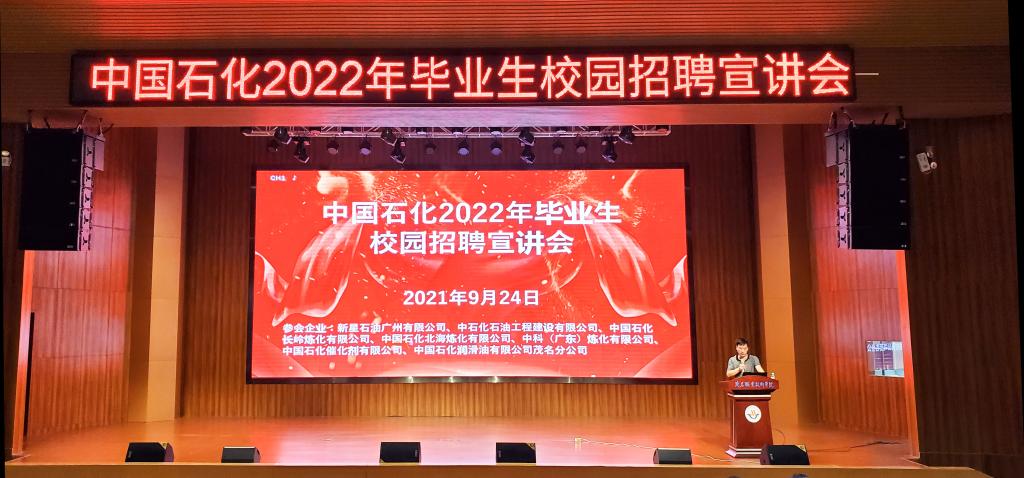 9月24日上午,中石化2022年毕业生校园招聘宣讲会在南校区学术报告厅举行。中石化作为2020世界500强排名第2位的企业,继续保持毕业生引进规模和力度,连续三年校园招聘规模保持1万人以上。本次来我校参加校园招聘宣讲会有中国石化集团下属6家企业,分别是新星石油广州有限公司、中石化石油工程建设有限公司、中国石化长岭炼化有限公司、中国石化北海炼化有限公司、中科(广东)炼化有限公司、中国石化催化剂有限公司、中国石化润滑油有限公司茂名分公司。此外,广州石化、海南炼化也先后来校进行了招聘宣讲,目前中国石化集团下属8家企业来校进行了校园招聘宣讲会。我校19级石油化工技术专业、19级应用化工技术专业、20级应用化工技术专业(三二分段)及机电相关专业的学生参加了宣讲会。会议由化学工程系负责人主持。