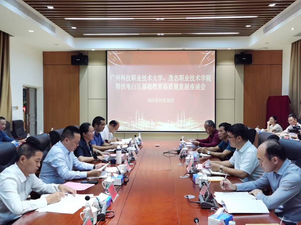 为贯彻落实省教育厅《关于做好全口径全方位融入式帮扶粤东粤西粤北地区基础教育高质量发展工作的通知》精神,积极发挥好高校服务地方作用,进一步推动对口帮扶工作的落地实施,细化对口帮扶措施,助推电白区基础教育高质量发展,10月28日,结对帮扶电白区基础教育高质量发展座谈会在我校南校区图书馆二楼会议室召开。电白区委教育工委书记、区教育局党组书记、局长梁镇源,广州科技职业技术大学滨海校区负责人张伟彪,茂名职业技术学院副院长曾萍,区教育局和两所高校相关部门负责同志,中小学校长代表出席座谈会。座谈会由梁镇源主持。