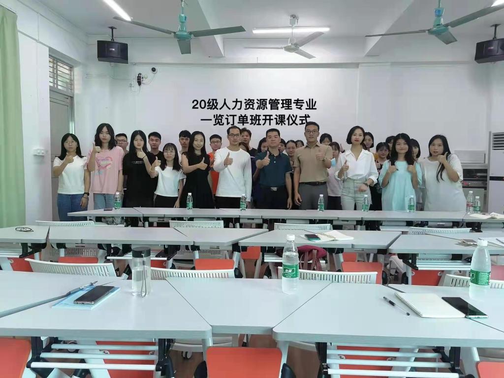 为贯彻落实学校“创新校企协同育人模式,构建校企命运共同体”的理念,进一步深化校企合作、产教融合、协同育人模式, 11月4日下午,人文系20级人力资源管理专业一览订单班于北校区1栋教学楼406室正式开班授课。授课前,订单班举行了简单而隆重的开课仪式。深圳市一览网络股份有限公司企业服务中心总经理卢致毅、人文与传媒系主任梁辉良、一览公司总裁办主管贺青莲、人力资源教研室负责人车德昌、订单班指导教师张子妮及订单班全体同学等30余人出席了仪式。