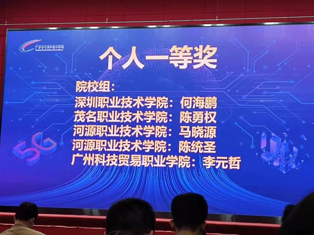近日,由广东省人力资源和社会保障厅主办的2021年广东省职业技能大赛---广东省5G无线网络维护与优化职业技能竞赛决赛阶段的比赛在广东邮电职业技术学院举行。计算机工程系非常重视此次赛事,精心组织学生参赛。通信技术专业的陈勇权同学在周勇老师的指导下,与来自全省职业院校的200多名选手同场竞技。在激烈紧张的比赛中,陈勇权同学不畏强敌,奋勇拼搏,最终脱颖而出,荣获院校组个人一等奖,并获得广东省人力资源和社会保障厅颁发的职业技能等级证书。