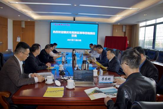 张庆向来访客人表示热烈欢迎,详细介绍了学校的专业建设、招生就业、校企合作等办学情况。林晓东介绍了此行来访目的并详细介绍了肇庆市高新区产业发展及人才需求情况。