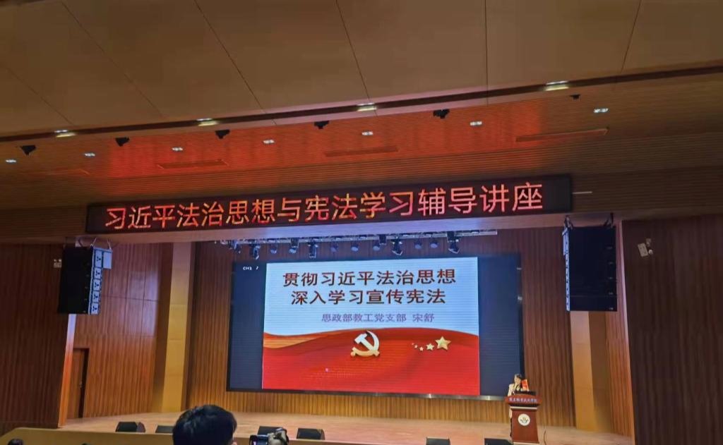 为进一步深入学习贯彻习近平法治思想,大力弘扬宪法精神,增强宪法观念,让宪法走进校园,推动全校师生树立宪法意识,学校于近日在南校区学术报告厅举行了两场“习近平法治思想与宪法学习辅导讲座”。马克思主义学院宋舒、周虾娇老师分别作专题辅导,南校区近500名学生聆听了讲座。
