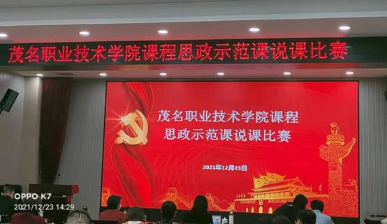 为贯彻落实习近平总书记在全国教育大会上的重要讲话精神,有效推进我校课程思政全面展开,12月23日下午,在学校北校区图书馆多功能会议室举行了茂名职业技术学院课程思政示范课说课比赛。来自全校6个教学单位的12名教师参与角逐,一决高下。各系部主任、副主任、教研室主任、教务处相关人员、马克思主义学院全体专兼职教师到场观摩,比赛由马克思主义学院副主任宋舒主持。