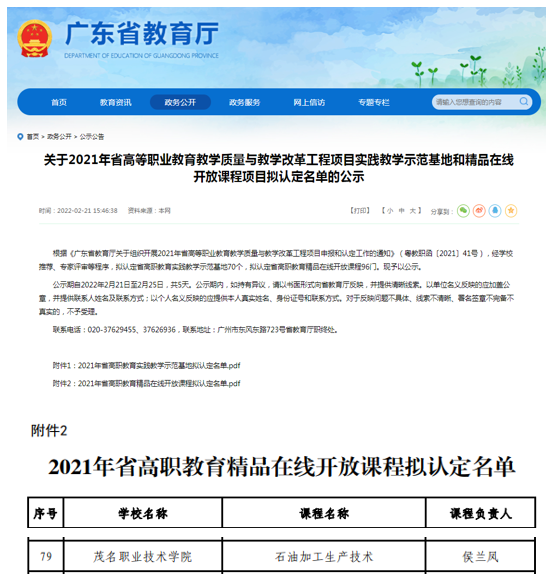近日,广东省教育厅公布了2021年省级精品在线开放课程立项建设名单,我校化学工程系侯兰凤老师主持的《石油加工生产技术》课程获得省级精品在线开放课程认定项目。