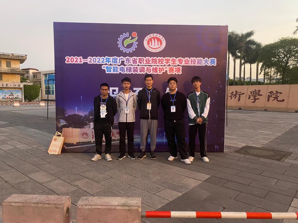 近日,2021-2022年度广东省高职院校学生专业技能大赛“智能电梯装调与维护”赛项在江门职业技术学院落下帷幕。我校机电信息系电梯工程技术专业张相溥、彭子杰和来自工业机器人技术专业谢开创、电气自动化技术专业邓越中组成的两队选手,在教练组王开、曾宪桥、肖志钊老师的指导下,赛场上大展拳脚,大放异彩,在历时两个半小时的激烈角逐中上演了一出出精彩的“龙虎斗”,最终从24所院校的48支队伍96名选手中脱颖而出,分别以第十、第十三名的好成绩双双获得二等奖。