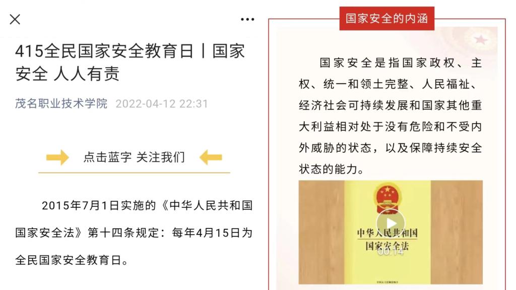 2022年4月15日是第七个全民国家安全教育日。4月11-15日期间,学校以“树牢总体国家安全观,感悟新时代国家安全成就,为迎接党的二十大胜利召开营造良好氛围”为主题,开展了形式多样的全民国家安全教育日主题活动,通过网络答题、下发宣传资料、召开主题班会、观看影片、校园设点宣传等形式引导广大师生树牢总体国家安全观,进一步强化青年学子的责任与担当。