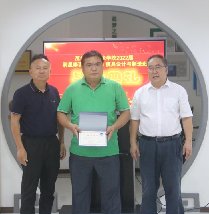 在毕业典礼上,张庆对全体学员经过自己的不懈努力完成了全部学业,并按时取得毕业证书表示祝贺,对公司领导关心支持学员的学习表示感谢。张庆指出,产教融合、校企合作是职业教育的主要办学模式和重要教育教学手段,是培养社会适应性人才的重要途径。润星泰作为铝合金铸造产业的民族龙头企业,与学院共同开展模具设计与制造现代学徒制人才培养意义重大。两年来,我校派出最强的师资团队与润星泰的师傅们一起,研讨修订人才培养方案,改革完善教学内容,开展针对性教学改革,为培养高质量模具人才做出了应有的努力。张庆寄语毕业班学员要谨记修德、强技、求实、创新的校训,常怀感恩之心,强化自律与责任,在工作中勇挑重担,发扬劳动精神、劳模精神、工匠精神,在润星泰这个大平台不断发光发热,为企业做出应有的贡献。同时也衷心希望校友们常回母校看看。任怀德衷心感谢茂职院对企业的信任和支持,感谢学院领导、老师对企业员工用心用情的培养和辛勤付出,祝贺员工在完成公司的工作任务后经过自己的努力顺利拿到毕业证书,希望以此为契机和新的起点,继续努力不停步,学以致用,为公司作出更大的贡献。最后,张庆和任怀德一起为毕业生颁发毕业证书,共同祝愿校友们百尺竿头更进一步!