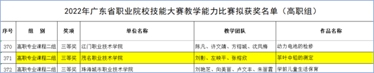 近日,广东省教育厅公布了2022年广东省职业院校技能大赛教学能力比赛获奖名单,我校化学工程系专任教师刘影、左映平、张榕欣团队在比赛中获得三等奖的好成绩。