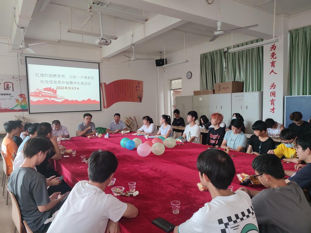 我国各族人民同呼吸、共命运、心连心,这是中华民族强大凝聚力和非凡创造力的重要源泉。10月2日,学校党委书记扶国出席机电信息系举办外省籍和少数民族学生座谈会,与来自全国10多个省(区、市)的70多名同学欢聚一堂,道乡情、话未来,共同祝愿我们伟大的祖国繁荣昌盛。扶国殷切希望同学们牢记“修德、强技、求实、创新”校训,争做立行力行之人,主动承担起在常态化疫情防控中应尽的责任和义务,积极引导更多同学共同维护校园安全稳定的大局。做到心中有党、一心向党,不负青春、积极传递正能量,主动承担起应尽的责任和义务,为打造平安校园、喜迎二十大交出一份茂职院大学生的满意答卷。10月1-2日,学院党委副书记、院长张庆先后到南北校区计算机工程系、人文与传媒系和经济管理系看望新疆籍和藏族的学生,召开座谈会,深入了解同学的学习生活近况、生活习惯等,张庆希望新生们尽快适应学校的生活,牢固树立“中华民族一家亲”的意识,积极加强与各民族学生交流融合;同时注意自身防护,配合学校做好疫情防控等各项工作。勉励同学们要坚定理想信念,珍惜学习机会,注重个人的德智体美劳全面发展,不断培养自己的知识能力和综合素质,在服务国家、服务社会中展现自身的价值。10月2日,经济管理系举办座谈会,来自维吾尔族、彝族、苗族、土家族、回族、壮族、瑶族、景颇族等少数民族学生代表纷纷畅谈了自己家乡的文化和习俗,分享了各自的成长经历以及进校以来的学习生活和职业规划,真诚表达了对学校优美的校园环境、良好的学习气氛、和睦的民族团结氛围的热爱之情。