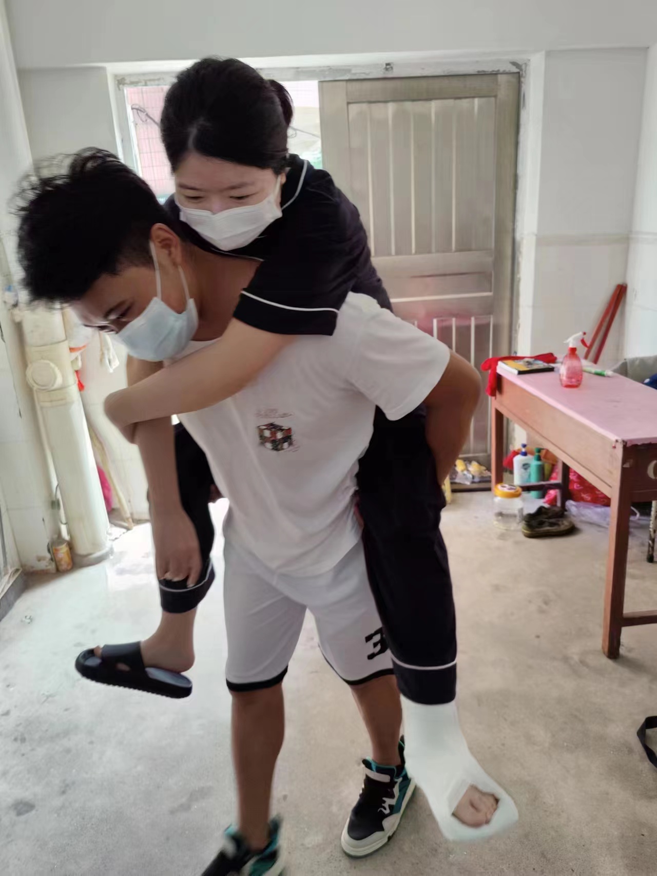 退役士兵志愿者刘同学每天背脚部受伤同学上下七楼做核酸检测