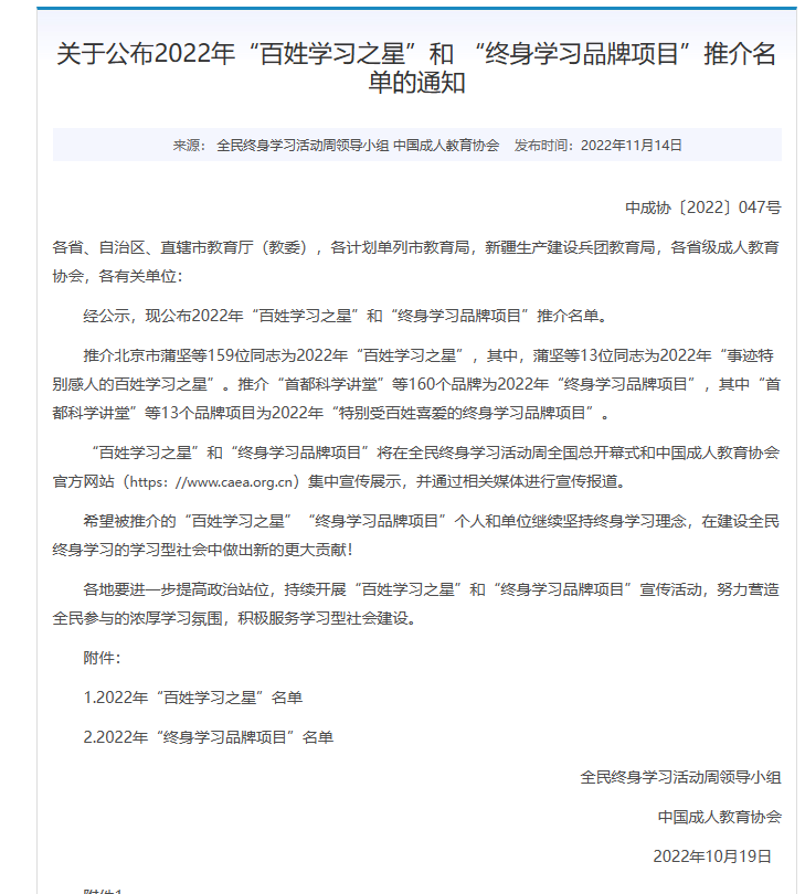 此次评比根据教育部职业教育与成人教育司《征集推介2022年“百姓学习之星”和“终身学习品牌项目”有关要求》提出的开展“百姓学习之星”和“终身学习品牌项目”推荐和宣传展示活动的要求,由全民终身学习活动周工作小组组织全国各省(自治区、直辖市)开展的“百姓学习之星”和“终身学习品牌项目”征集活动。