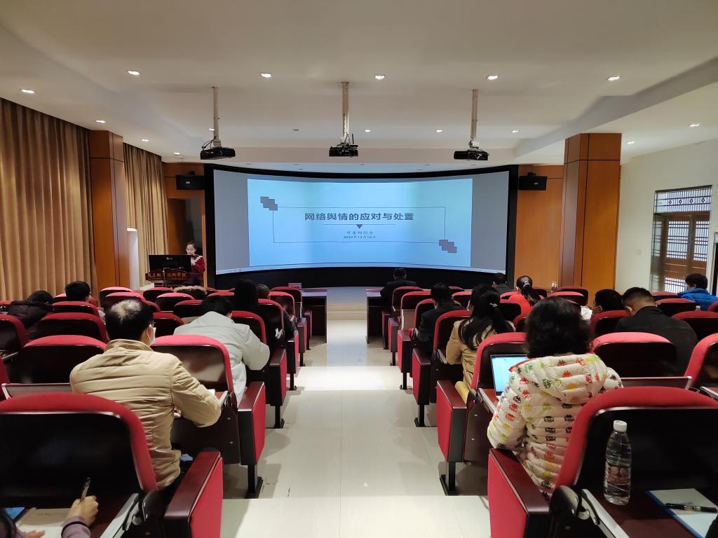 为加强校园网络安全工作,全面提升党员干部网络舆情应对处置的专业能力,进一步提高舆论引导和风险化解能力,夯实我校宣传和意识形态主阵地,12月16日下午,我校在北校区2号教学楼105室举办了网络安全与舆情应对处置培训班。各党支部安全员暨舆情信息员、网络评论员, 微宣讲员暨宣传员共40多人参加培训。