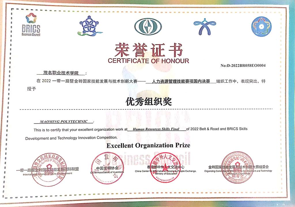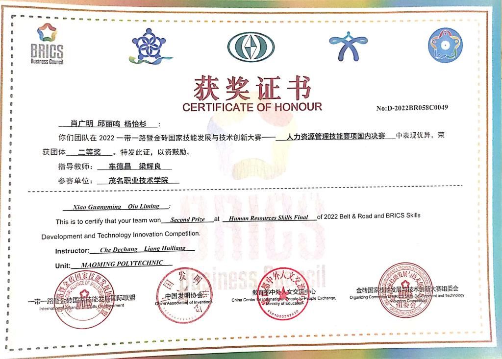 近日,“一带一路”暨金砖国家技能发展与技术创新大赛之人力资源管理技能赛项国内总决赛落下帷幕。全国总决赛由区域赛晋级的来自全国100支参赛队伍,五百多名指导老师及参数选手共同参与。我校人力资源管理专业学生肖广明、邱丽鸣和杨怡杉团队通过重重激烈竞争,最终获得全国总决赛二等奖,同时我校荣获“优秀组织奖”。
