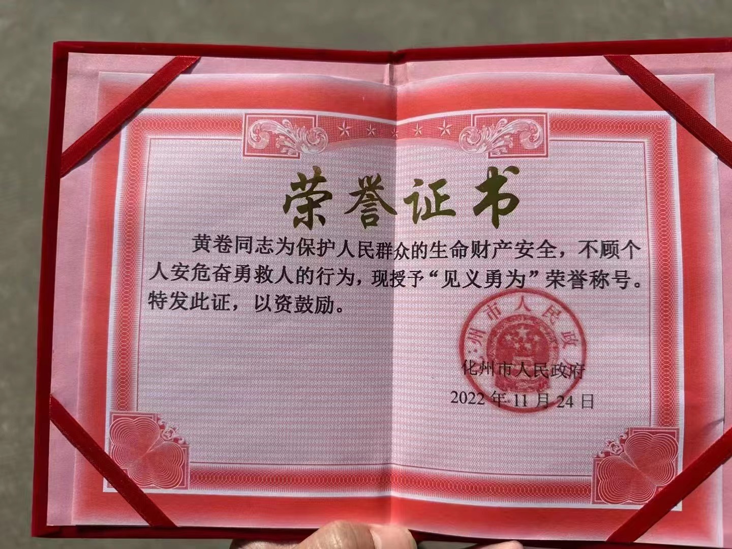 黄卷同学于2021年11月奋不顾身地穿过马路,拦截了化州一辆后轮突然起火的满载学生的大巴,与街坊合力扑灭起火的大巴,保障了人民群众的生命安全。黄卷同学见义勇为的精神得到了化州市公安局的表彰,为他颁发了荣誉证书和奖金。