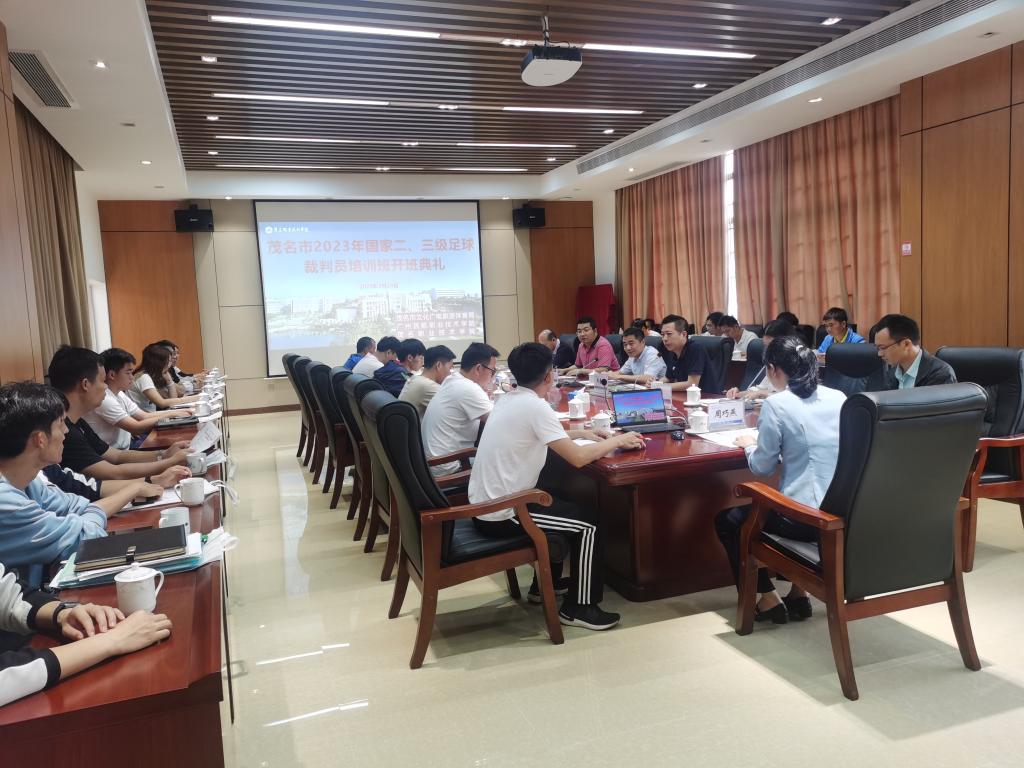 3月24日上午,由茂名市文化广电旅游体育局、广州民航职业技术学院、茂名职业技术学院联合举办的茂名市2023年国家二、三级足球裁判员培训班开班仪式在我校南校区图书馆二楼会议室举行。广州民航职业技术学院教务处副处长李航,学院教务处负责人陈平清,中国足协五人制足球国家级裁判郑春荣出席开班仪式。茂名文化广电旅游局、广州民航职业技术学院、茂南区教育局和电白区教育局相关科室负责同志,足球裁判员培训班的全体学员共40人参加开班仪式。会议由社科基础部负责人黄丽主持。