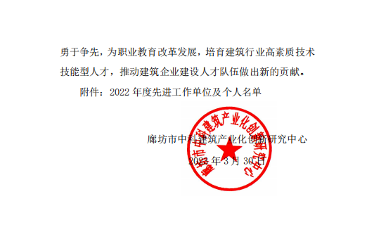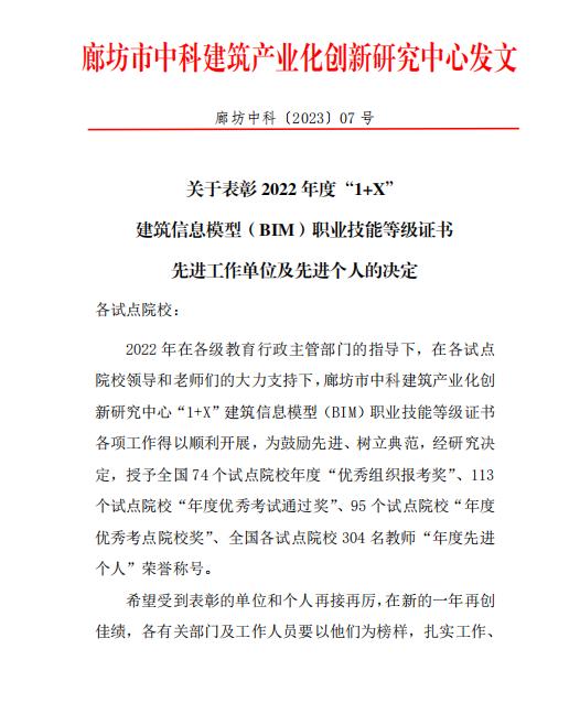 近日,“1+X”证书制度试点职业教育培训评价组织廊坊市中科建筑产业化创新研究中心,公布2022年度“1+X”建筑信息模型(BIM)职业技能等级证书先进工作单位及先进个人名单。我校在2022年度“1+X”建筑信息模型(BIM)职业技能等级证书试点工作中积极组织、精心筹备、管理规范、表现突出,被评为“年度优秀组织报考奖”,尹好、高林海两位教师被评为“优秀先进个人”。自2020年8月成功获批该证书考核站点以来,我校每年的培训人数、报考人数和通过率均位居全国前列,2021年度、2022年度连续两年荣获“1+X”建筑信息模型(BIM)职业技能等级证书先进工作单位。