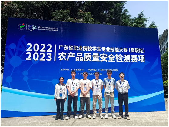2022-2023年度广东省职业院校学生专业技能大赛(高职组)农产品质量安全检测赛项于4月15-16日在广东轻工职业技术学院举行。我校派出2支代表队参赛,第一队由食品质量与安全专业吴杰浚、蓝建汉同学组成,指导教师刘影、左映平;第二队由食品检验检测技术专业刘华安、徐奕阳同学组成,指导教师甘钊生、杨璐璐。在为期2天的紧张角逐中,2支代表队在58支队伍中表现优秀,吴杰浚、蓝建汉代表队和刘华安、徐奕阳代表队分别荣获二等奖、三等奖。