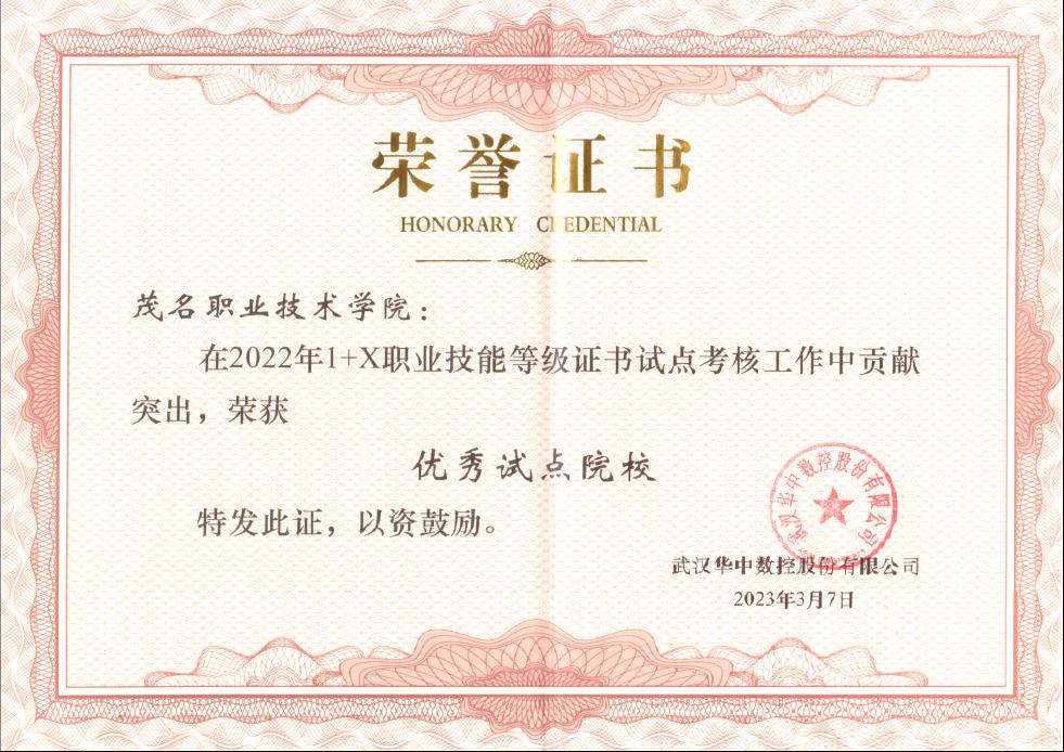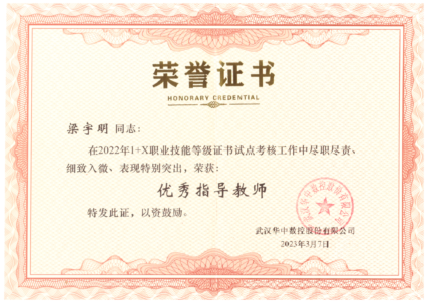 为推进职业教育“三教”改革,实现职业教育提质培优和高质量发展,近日,知名认证机构武汉华中数控股份有限公司召开2022年全国数控车铣1+X证书工作总结表彰暨2023年工作动员会,我校获评2022年数控车铣1+X证书试点工作示范院校,机电信息系梁宇明老师获评优秀指导教师。