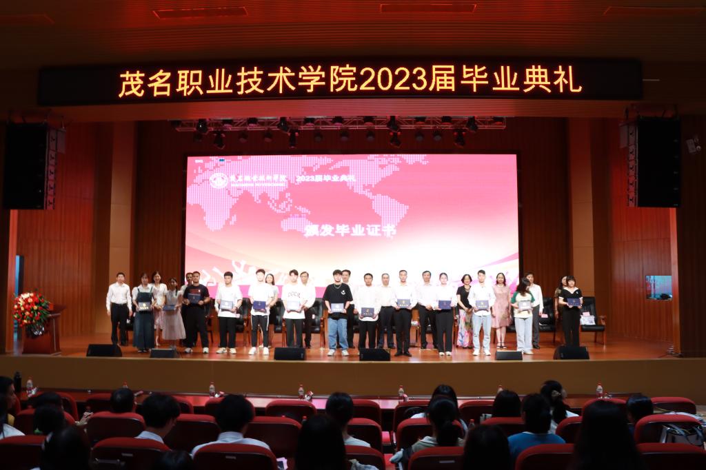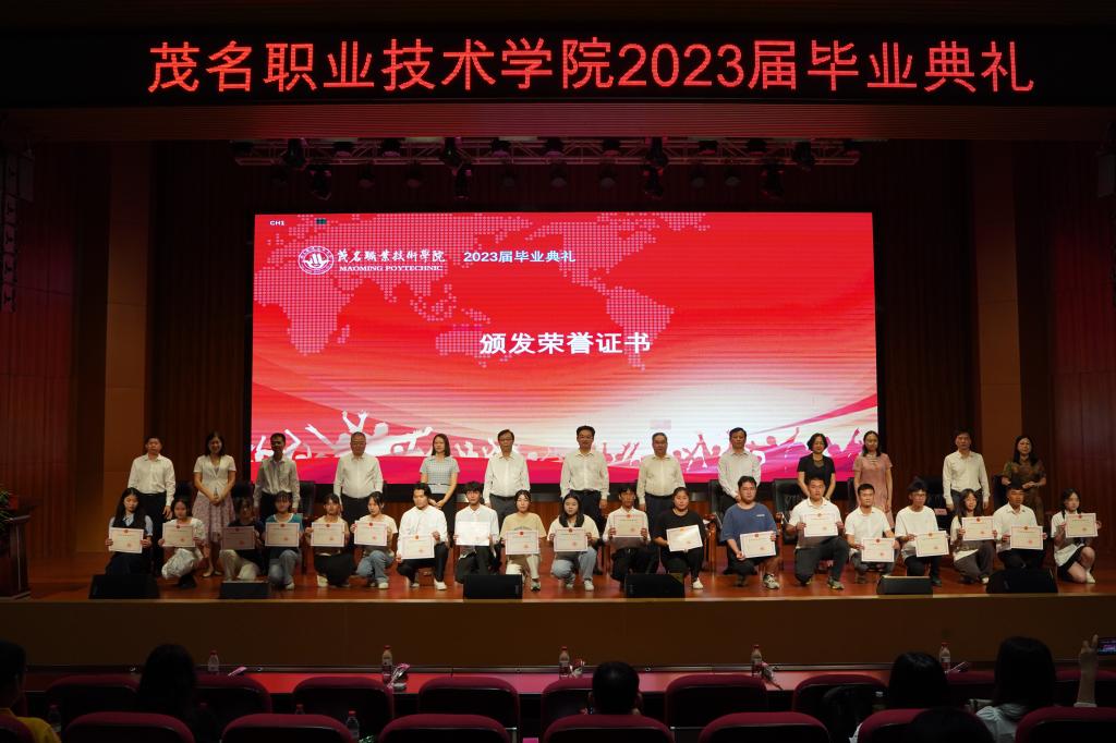 曾萍介绍2023届毕业生基本情况。钟茹宣读了《茂名职业技术学院关于表彰2023届优秀毕业生的决定》。谈毅宣读了《茂名职业技术学院2023届毕业生国家奖学金获奖名单》。主席台就座领导为获奖毕业生颁发了荣誉证书。