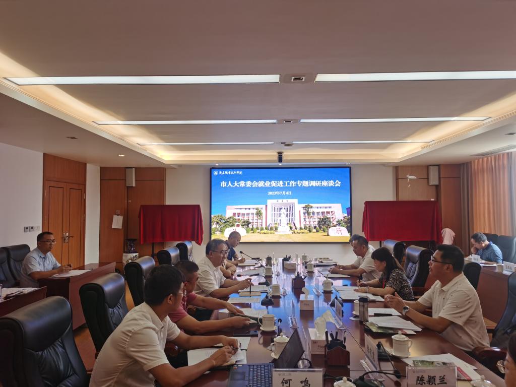 7月4日上午,市人大常委会副主任黄奕奕、市人大社会保障委主任委员人选梁鑫、市人力资源和社会保障局局长胡汉顺等一行13人来到我校开展就业促进工作专题调研。学校党委副书记、院长张庆,党委委员、副院长曾萍,学生处负责人、经济管理系和人文与传媒系就业工作负责人、就业指导中心相关人员参加会议。