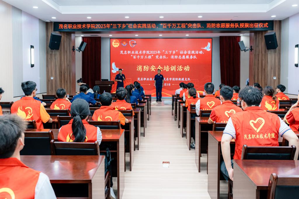 为深入学习贯彻党的二十大精神,按照省委、省政府关于实施“百县千镇万村高质量发展工程”的部署和团省委关于《广东青年下乡返乡兴乡助力“百县千镇万村高质量发展工程”三年行动方案》的要求,7月5日,茂名职业技术学院联合茂名市消防救援支队举行茂名职业技术学院2023年“三下乡”社会实践活动、“百千万工程”突击队、消防志愿服务队授旗出征仪式暨消防安全培训活动。茂名市消防救援支队副支队长马智良、全媒体中心主任邓上宏,茂名职业技术学院团委书记李锋成、土木工程系党总支副书记李振潭、化学工程系党总支副书记黄小翰、团委副书记梁凤燕以及茂名市消防救援支队各辖区志愿者负责人、消防工作人员,茂名职业技术学院学生处、团委干部,各系团委书记,各突击队和服务队指导老师和学生代表参加了活动。