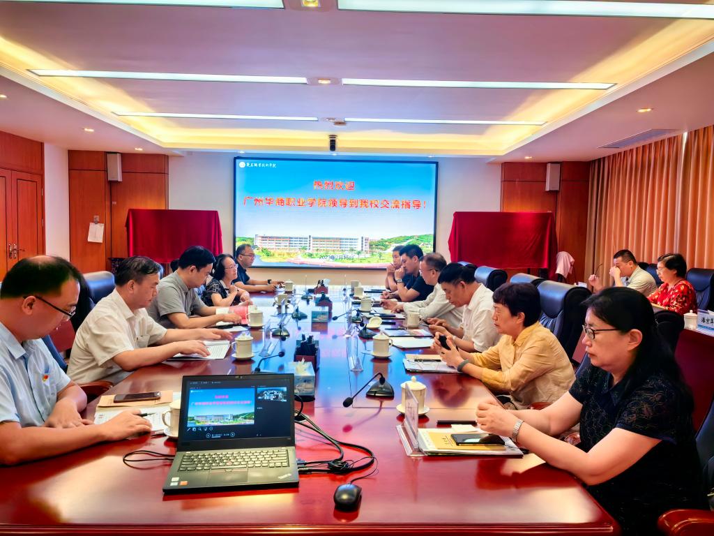 7月15日下午,广州华商职业学院党委书记翁礼成、校长林琨智一行到我校访问交流。党委书记扶国热情接待了翁礼成、林琨智一行,带领来宾参观了我校数字电商产业学院,并在北校区综合楼三楼第一会议室举行了座谈会。党委委员、副院长曾萍,党委办、学院办、人事处负责人,经管系、马克思主义学院相关人员参加座谈。