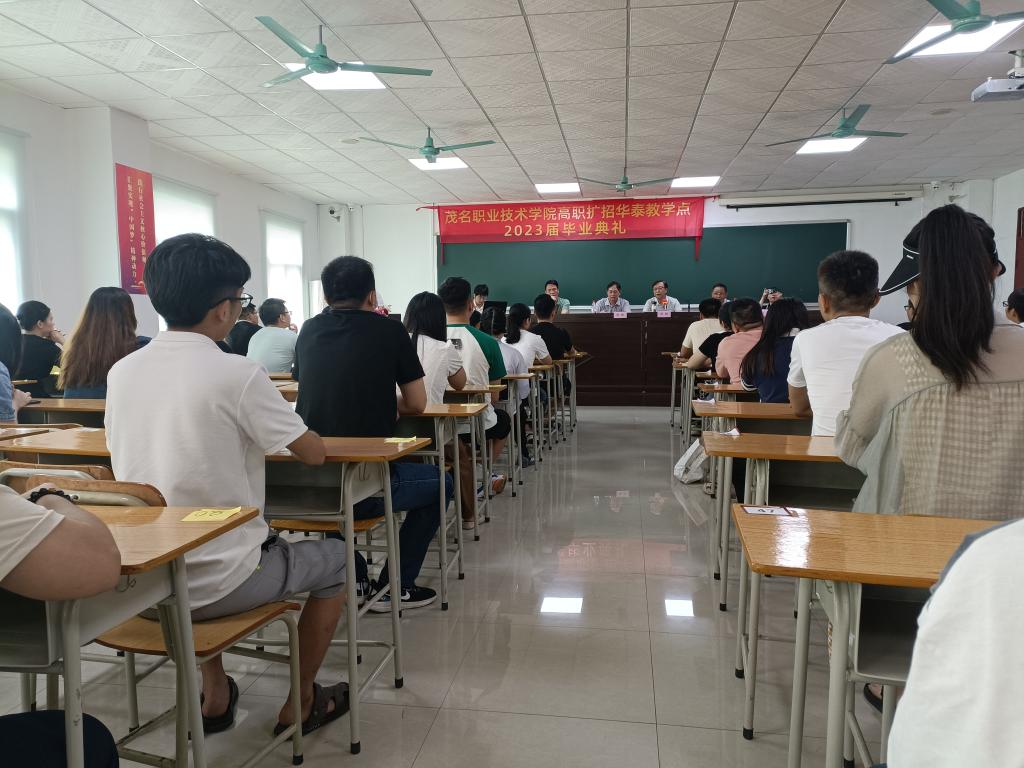 7月16日上午,我校在东莞市莞城华泰教育培训中心举行华泰教学点高职扩招2023届学生毕业典礼。学校党委委员、副院长谈毅出席毕业典礼。成人教育部负责人及相关人员、广东华泰教育科技股份有限公司总经理王泽林,广东华泰教育科技股份有限公司副总经理文娜、东莞市莞城华泰教育培训中心校长姜明智和该教学点高职扩招2023届毕业生代表参加毕业典礼。