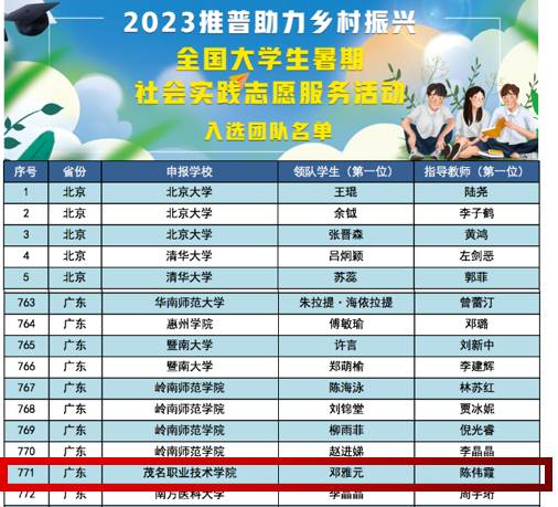 为深入学习贯彻党的二十大精神,按照省委、省政府关于实施“百县千镇万村高质量发展工程”的部署和团省委关于《广东青年下乡返乡兴乡助力“百县千镇万村高质量发展工程”三年行动方案》的要求,茂名职业技术学院“百千万工程”突击队、茂名职业技术学院消防志愿服务队的133名师生于2023年7-8月赴广东省各乡镇开展“三下乡”社会实践活动暨青年大学生“百千万工程”突击队行动。茂名职业技术学院1支服务队荣获“推普助力乡村振兴”全国大学生暑期社会实践志愿服务队、2支服务队荣获广东大中专学生志愿者暑期文化科技卫生“三下乡”社会实践活动暨广东青年大学生“百千万工程”突击队行动省级重点团队、3支服务队荣获广东省“百千万工程”突击队的志愿服务队。各服务队活动事迹分别在南方Plus、茂名日报、龙眼直播、茂名网、茂名共青团公众号、信宜市广播电视台公众号等省市县级官方媒体进行报道。