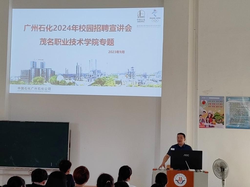 中国石油化工股份有限公司广州分公司党校副校长、党委组织部班子成员许洪涛深情回顾了广州石化半个世纪以来立足南粤,创新不息,服务珠三角的社会担当。他感谢茂名职业技术学院一直以来为广石化提供优秀的人力资源,在实际中践行“强国有我”的时代担当。许洪涛向同学们详细地介绍广州石化的薪酬待遇、住宿条件、工作环境、职业发展前景和招聘流程,丰厚的条件深深吸引了同学。他鼓励同学们树立信心、积极备考,期待在广石化与大家相会。