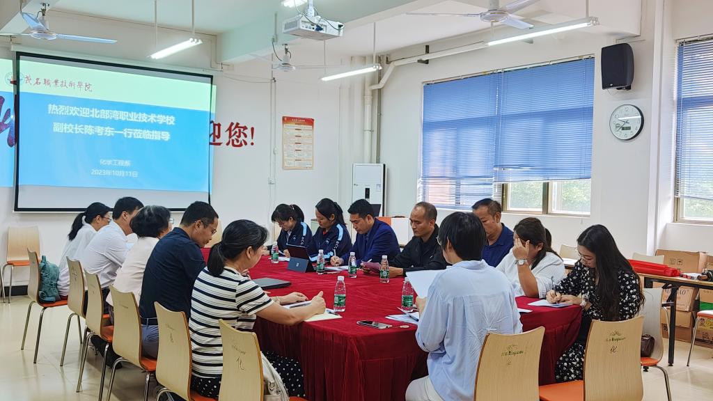 10月11日上午,北部湾职业技术学校副校长陈考东率精细化工技术专业群到我校进行考察交流。学校党委委员、副校长曾萍,化学工程系负责人及石油化工技术专业群相关老师参加座谈会。