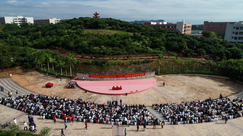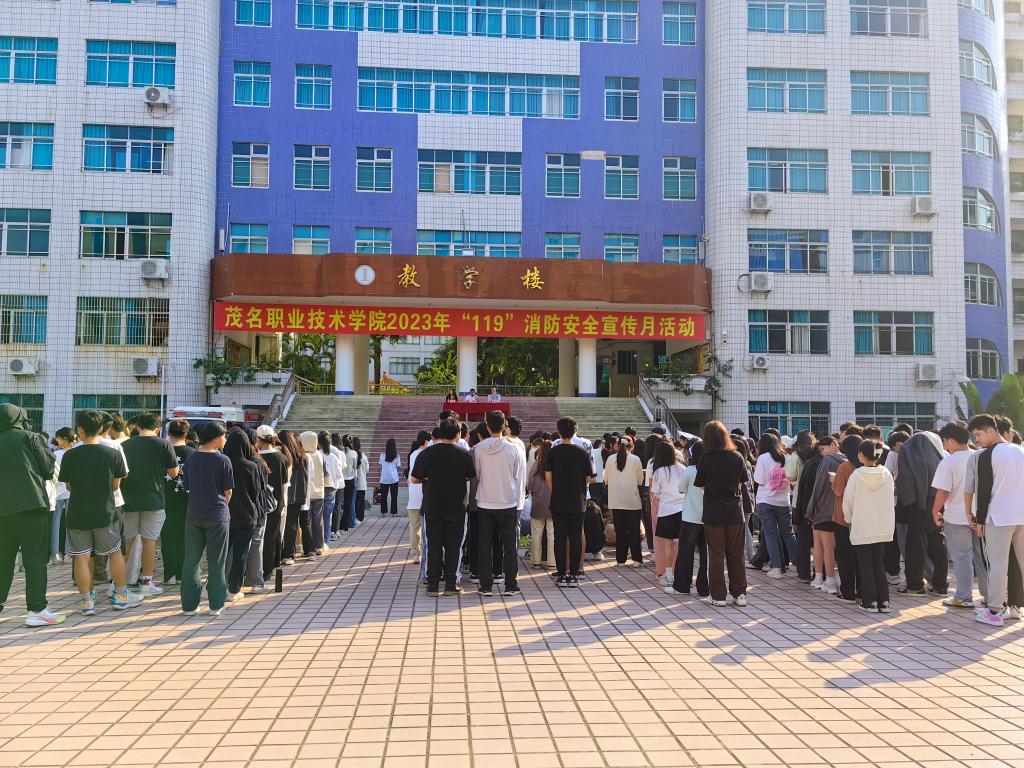 为了提高学生消防安全意识,增强消防安全防范能力,学校于11月16日下午和11月23日下午在南校区智慧广场和北校区广场分别召开了2023年“119”消防安全宣传月活动。茂名市消防救援大队龚斌科长和茂名市电白区高地消防站王志楼站长现场指挥。全体2023级新生和部分教职工参加了本次活动。