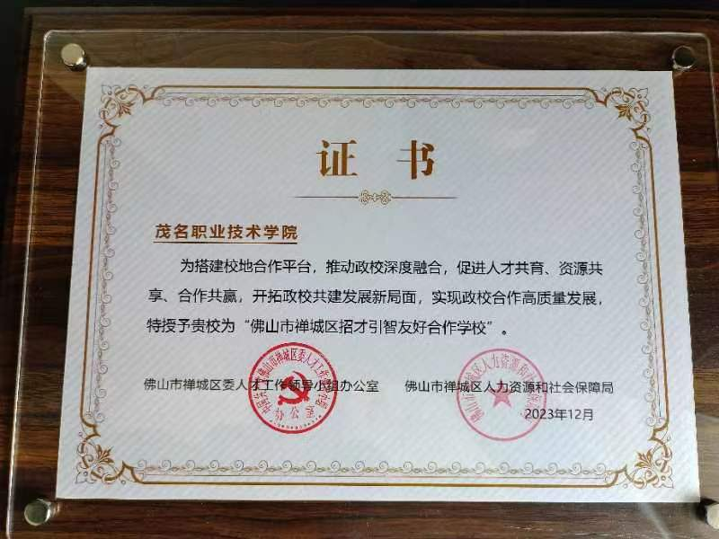 为加深高校与禅城区的情感链接,推动政校企三方人才引育合作,12月14—15日,佛山市禅城区委人才工作领导小组办公室、禅城区人力资源与社会保障局共同举办“禅聚英才,智造未来”2023年名校进禅活动,中山大学、暨南大学、华南师范大学、郑州大学、广西大学、广东石油化工学院、茂名职业技术学院、佛山职业技术学院等41所院校被授予“佛山市禅城区招才引智友好合作学校”称号。