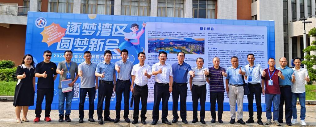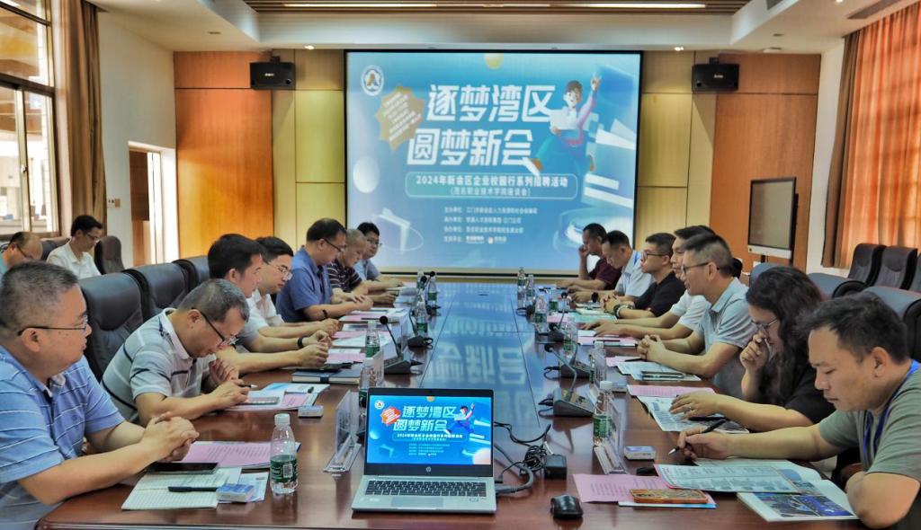 4月25日下午,江门市新会区2024“逐梦湾区 圆梦新会”招才引智活动(粤西首站)在我校南校区图书馆火热举行。新会区人社局林国富主任率江门市大光明电力设备厂、江门耀皮工程玻璃有限公司等20家知名企业携500多个优质岗位参会,吸引了机电、化工、计算机类专业的1000多名毕业生踊跃应聘。学校党委书记扶国出席校地企座谈会,并与企业HR们亲切交流。