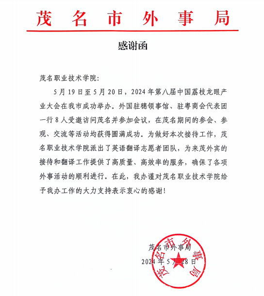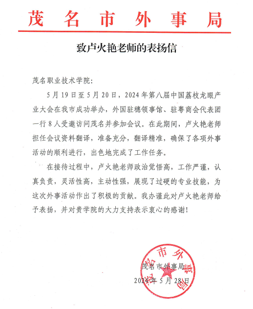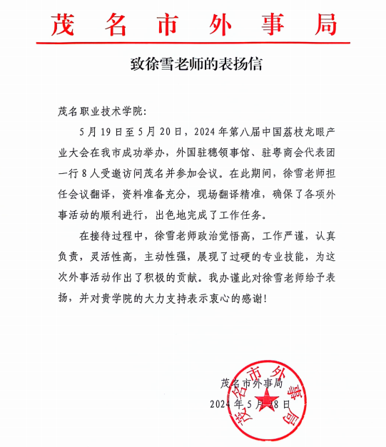 近日,我校派出英语翻译团队支持第八届荔枝龙眼产业大会受到表扬。茂名市外事局特为学院发来感谢函,也给基础课部徐雪、卢火艳两位英语老师发来表扬信,对学校和老师的工作给予高度评价。