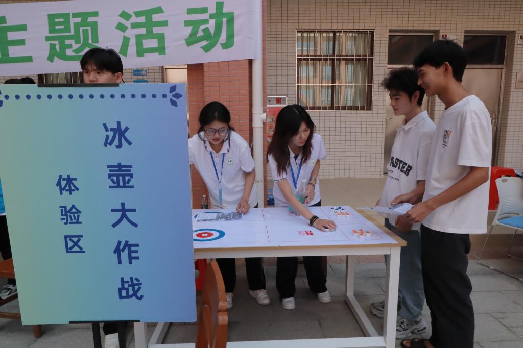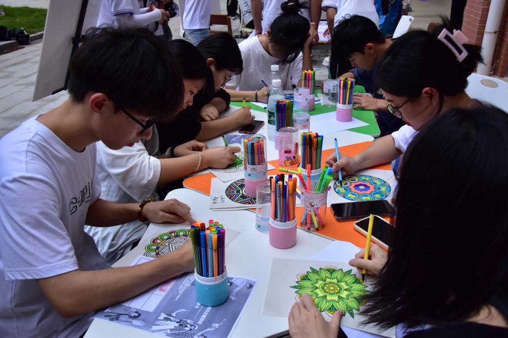 南校区设计了心语墙、心有灵犀、听歌识曲、甩掉焦虑乒乓球、青春涂鸦站、情绪魔法笔、冰壶大作战、曼陀罗绘画八个主题游戏。其中,甩掉焦虑乒乓球和冰壶大作战最受欢迎,同学们通过运动的方式释放压力,放松心情。参与曼陀罗绘画的同学表示,曼陀罗绘画具有治愈的力量,可以让自己静下心、专注表达自己的想法,释放不开心的负面情绪,画完之后,感觉整个人都充满正能量。在活动现场工作人员的指引和带领下,同学们积极热情参与,沉浸式体验获得一致好评。