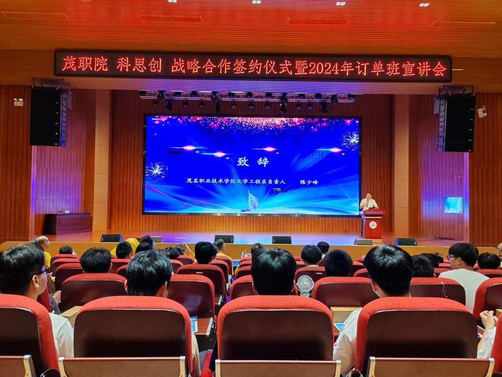 6月19日,学院与科思创战略合作签约仪式暨2024年订单班宣讲会在学院南校区学术报告厅举行。科思创聚合物(深圳和珠海)有限公司总经理何岩峰、广州科思创聚合物有限公司生产基地总经理周辉武等企业代表一行10人,学院副院长董利,教务部负责人陈平清,化工系负责人陈少峰、各教研室主任、辅导员以及22级化工专业学生出席本次仪式。仪式由化工系党总支副书记黄小翰主持。