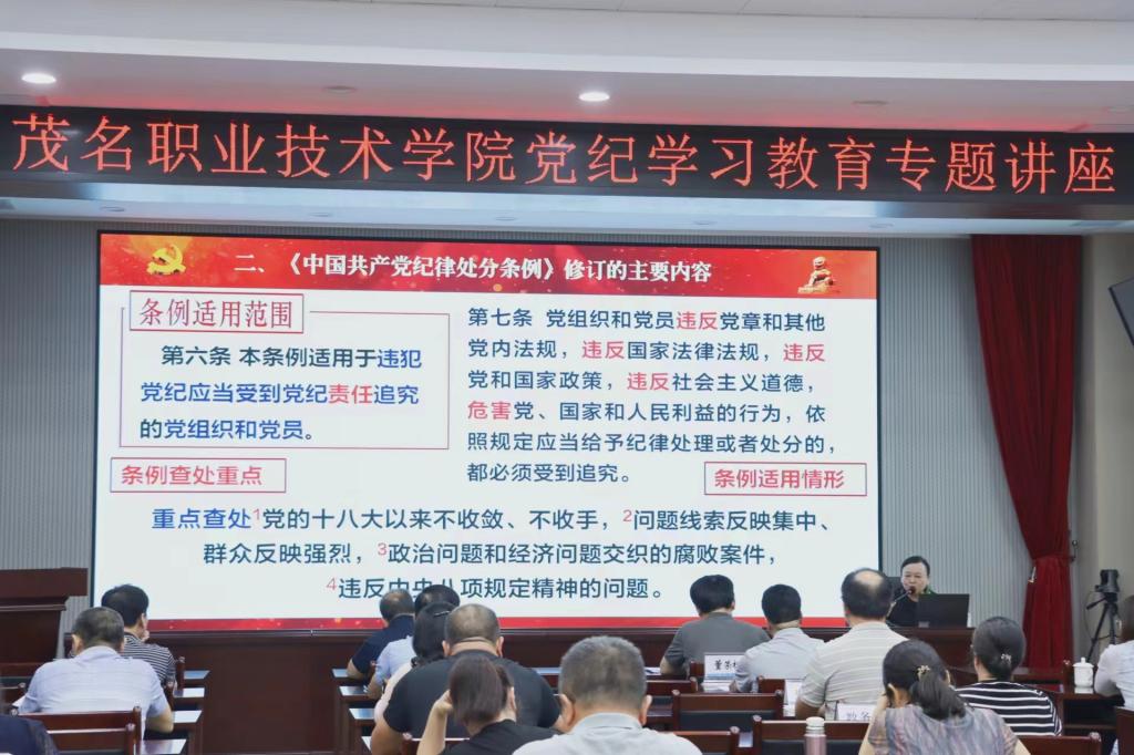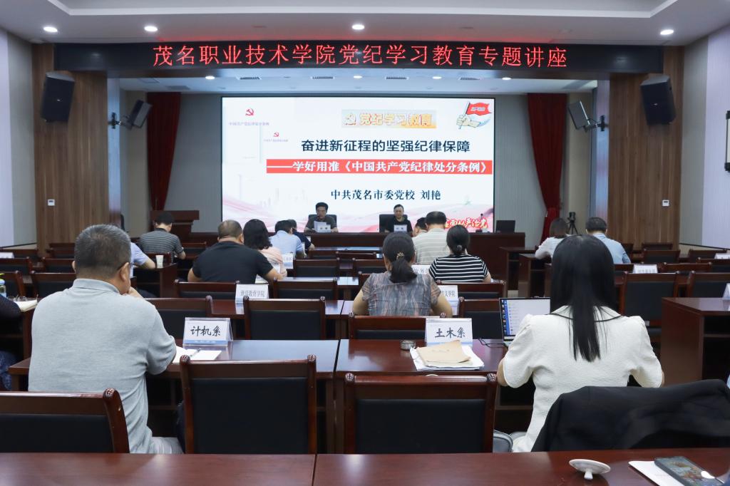 为深入贯彻落实党中央关于开展党纪学习教育的相关部署和工作要求,推动我校党纪学习教育走深走实、见行见效。6月27日下午,学校在北校区图书馆多功能报告厅举办党纪学习教育专题讲座,邀请中共茂名市委党校四级调研员、政学教研室主任,茂名市委理论宣讲专家团成员刘艳副教授作党纪学习教育专题讲座。本次讲座由党委书记扶国主持,学校领导,各系党总支书记、副书记,各党支部书记及学校党纪学习教育专班成员参加讲座。