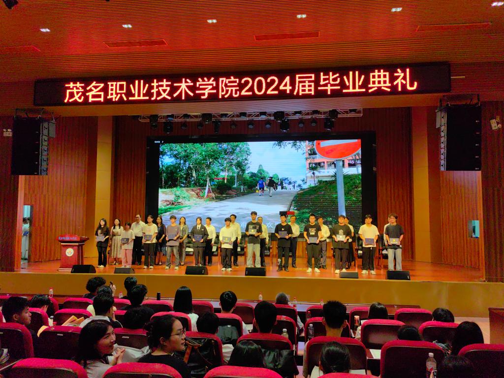 董荣权宣读了《茂名职业技术学院2022—2023学年届国家奖学金获奖名单》。董利宣读了《茂名职业技术学院关于表彰2024届优秀毕业生的决定》。主席台就座领导为获奖毕业生颁发了荣誉证书。
